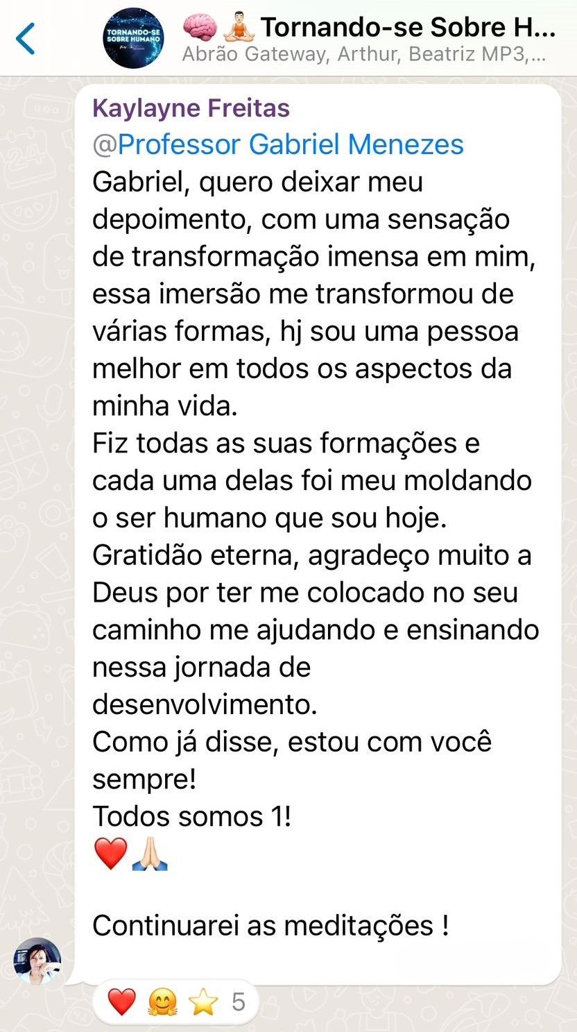 Professor Gabriel, você é um presente divino à humanidade. Desejo profundamente, que seu conhecimento alcance um nível internacional, porque há muitas nações que se beneficiariam de tal. Todos os dias sou grato por tê-lo conhecido e ter tido acesso ao seu trabalho lá em 2020.